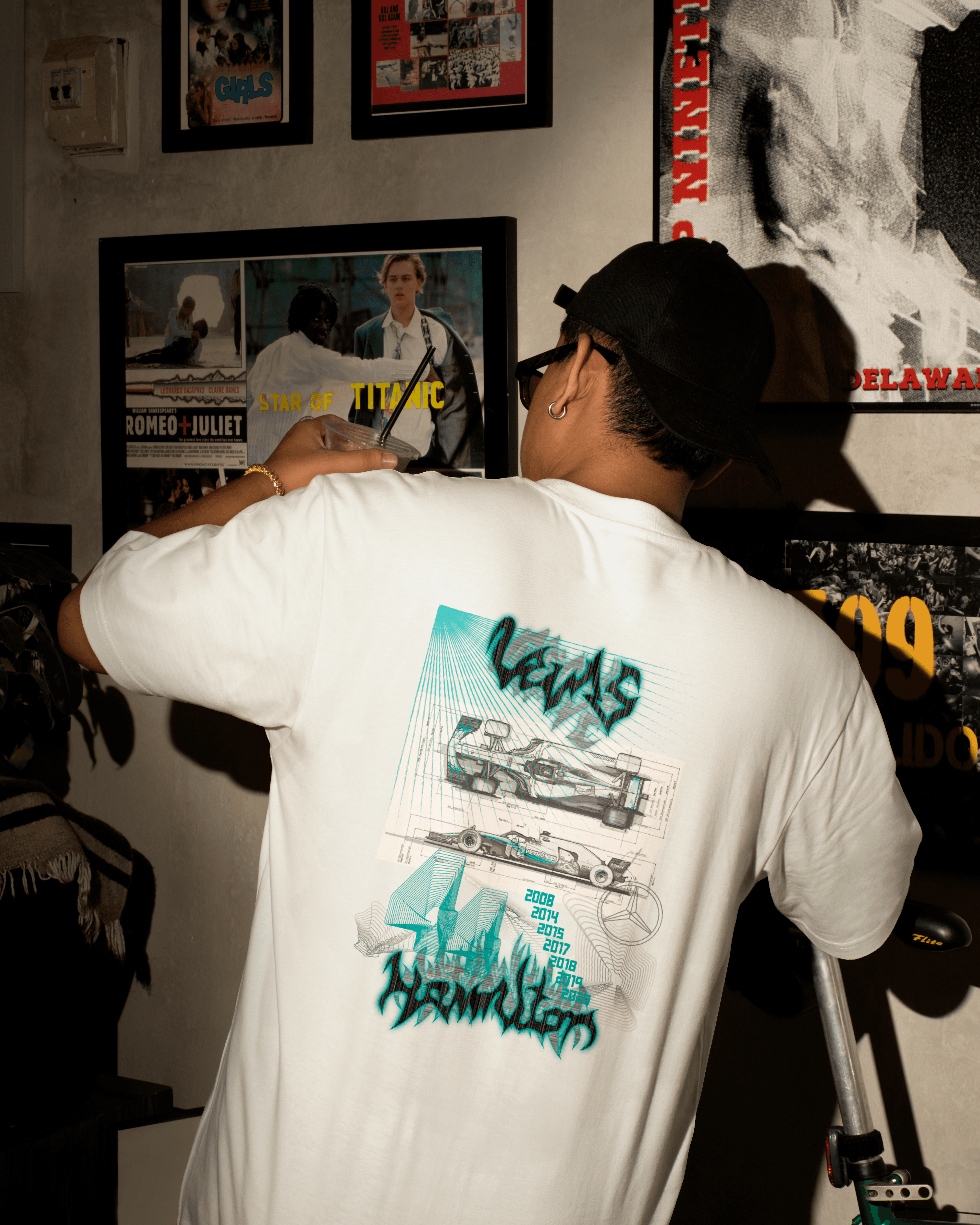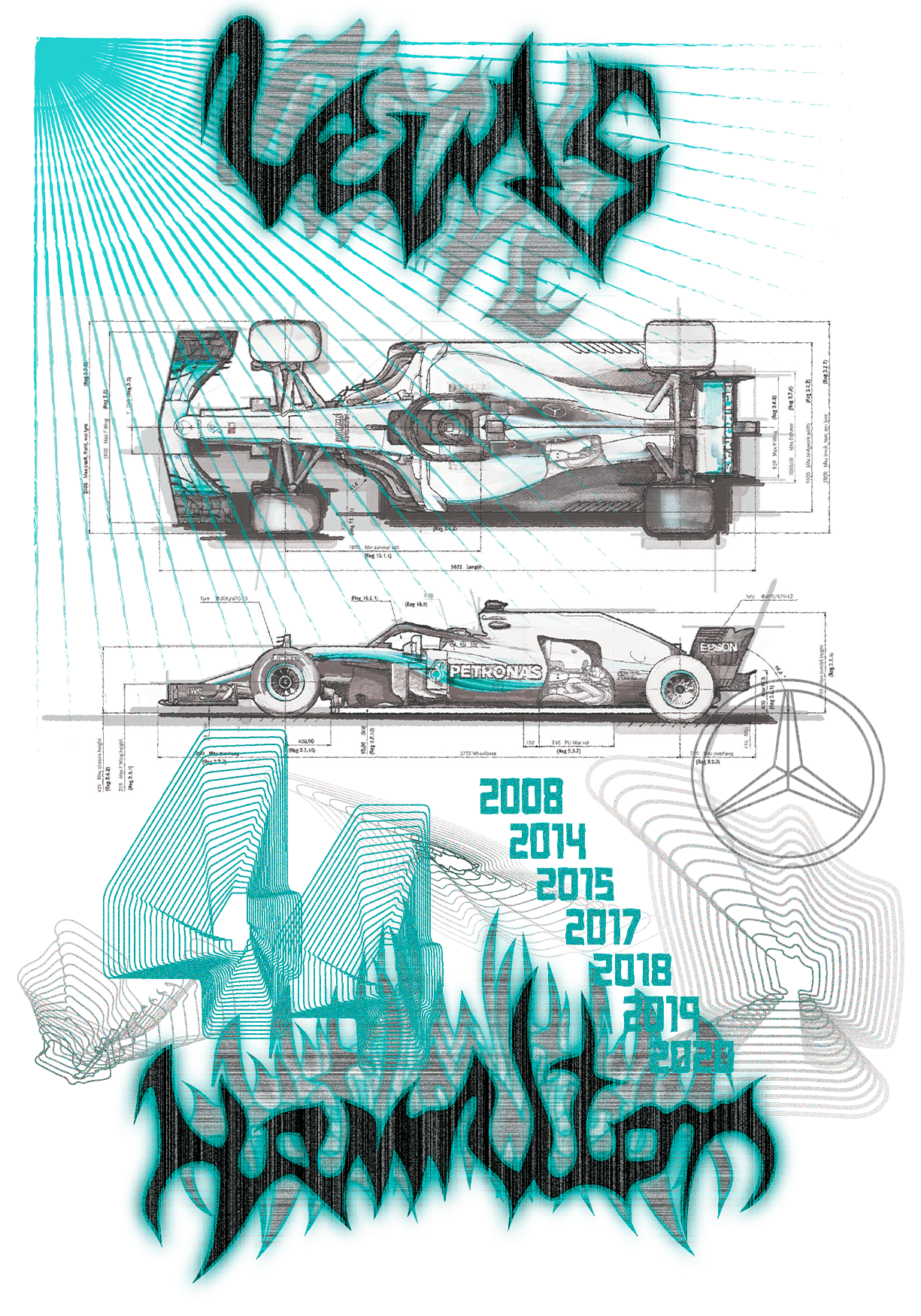 Case: Create a print that you would like to wear or use. Concept: The print is inspired by my interest in Formula 1 and my favorite driver, Lewis Hamilton. At the time of designing, Hamilton was driving for Mercedes, and turquoise was his signature color. The design incorporates his racing number, 44, and highlights the years he became Formula 1 World Champion, blending personal fandom with visual storytelling to create a wearable and meaningful piece. (Solo Project)
