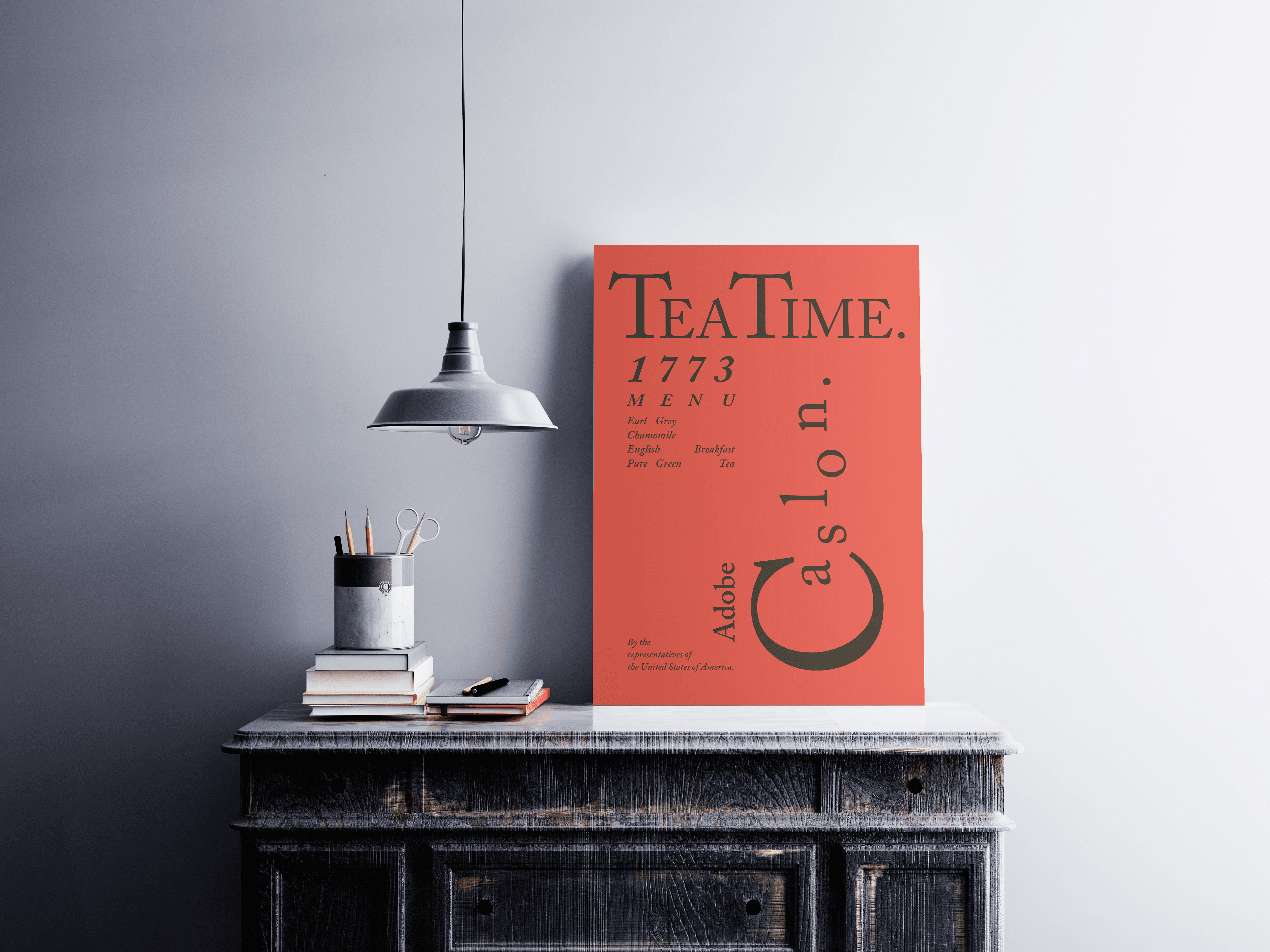 Case: Create a poster using only letters in the font Adobe Caslon. Concept: The poster references the Boston Tea Party. Adobe Caslon was used in the US Declaration of Independence, and its creator, William Caslon I, designed ornaments for firearms, linking the font to history and conflict. The words Adobe Caslon are arranged in the shape of a steaming cup of tea, connecting the font’s history to the theme of tea and rebellion. (Solo Project)
